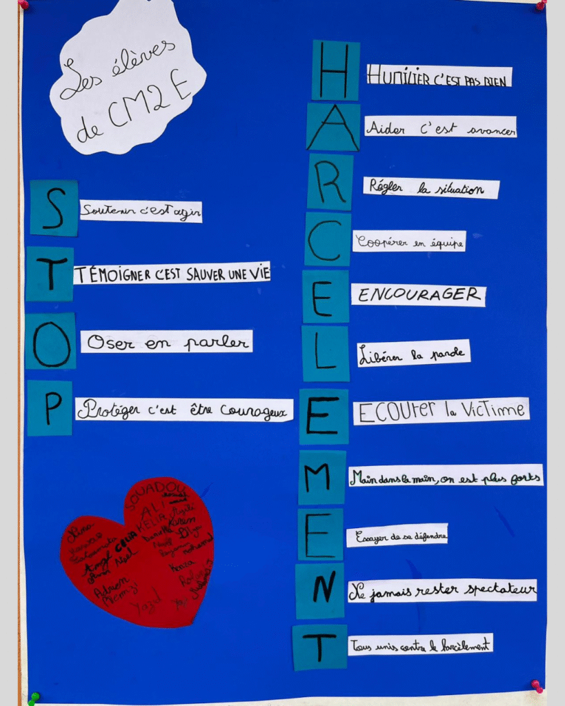 Poursuivant cette mobilisation, les élèves de CM2 E ont visionné quelques vidéos et échangé sur le respect, la bienveillance et le courage de parler.Ils ont ensuite créé un acrostiche des mots : « STOP HARCÈLEMENT » et réalisé une affiche collective sur fond bleu pour partager leurs messages de bienveillance. Une matinée riche en échanges et valeurs humaines, marquée par l’engagement de tous pour dire non au harcèlement.