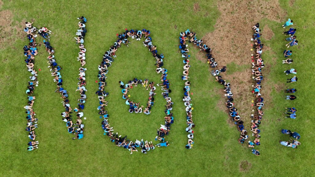 Nos élèves de CM1 et CM2 ont formé un NON puissant, symbole de respect et d’entraide. Du ciel, un regard est posé sur ce message: NON au harcèlement, OUI à la bienveillance. Ce geste simple rappelle que chacun peut intervenir pour que l’école soit un lieu sûr et joyeux.