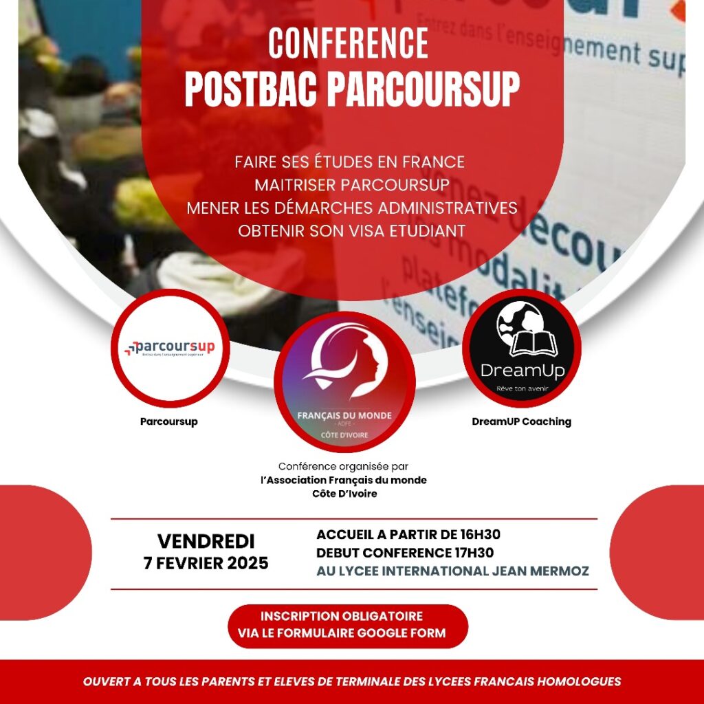 Cette conférence est organisée par l’ Association Français du Monde – Côte d’Ivoire , en partenariat avec Parcoursup et DreamUP Coaching . Elle s’adresse aux élèves et parents désireux d’avoir des informations claires et précises sur les démarches à suivre pour réussir leur admission postbac en France.