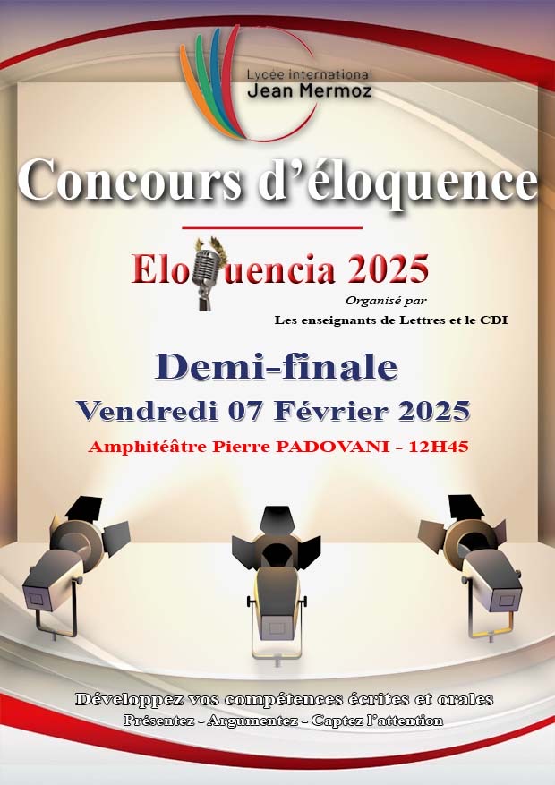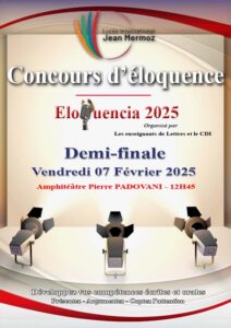 En effet, au terme de présélections de haute qualité, chaque classe présente ses représentants qui vont s’affronter le vendredi 07 février 2025 à l’amphithéâtre Pierre PADOVANI à partir de 12.45 à l’occasion de la demi-finale. Cette demi-finale se soldera par la sélection de 06 binômes qui s’affronteront en Mars 2025 pour le titre de meilleur orateur pour cette édition.