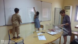 Mardi 03 octobre se sont déroulées les élections de nos 02 délégués de la classe. Nous avons presque fait comme les grands ! Le bureau de vote se trouvait dans le foyer du secondaire, équipé de 02 isoloirs et d’une urne ! Il y avait 05 candidates filles et 05 candidats garçons.