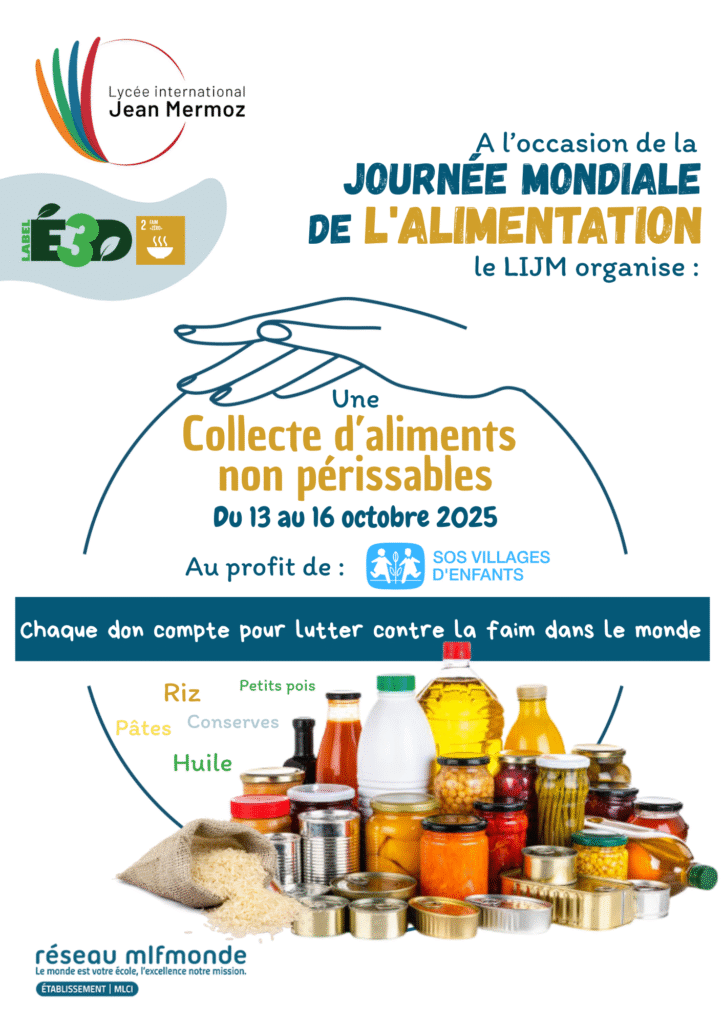 À l’occasion de la Journée mondiale de l’alimentation, le lycée organise une collecte de denrées alimentaires non périssables du 13 au 16 octobre. Cette initiative, pilotée par Mme DOSSI, enseignante de l’établissement, vise à soutenir les enfants en situation de vulnérabilité.