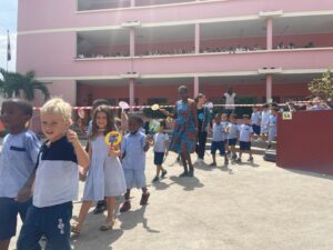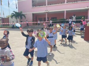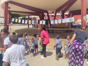 Les élèves de la maternelle ont fait une farandole pour la planète autour de la fontaine du lycée.