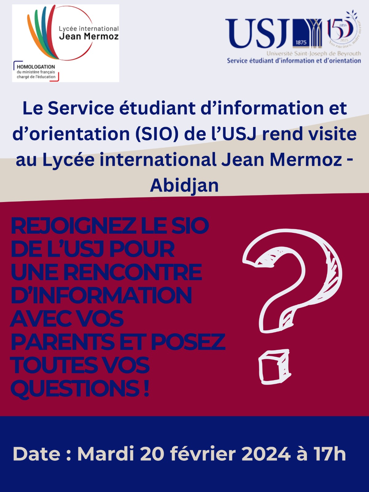 Une délégation de l’USJ sera au LIJM pour s’entretenir avec nos élèves.